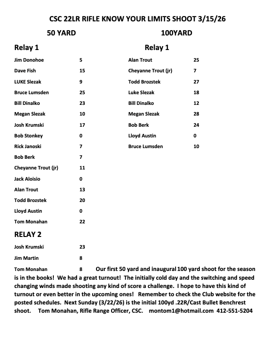 Scores are 10 points for each disc hit and may call stop at their discretion. If a shooter misses a disc all points earned are forfeited and is counted “0” for that relay.